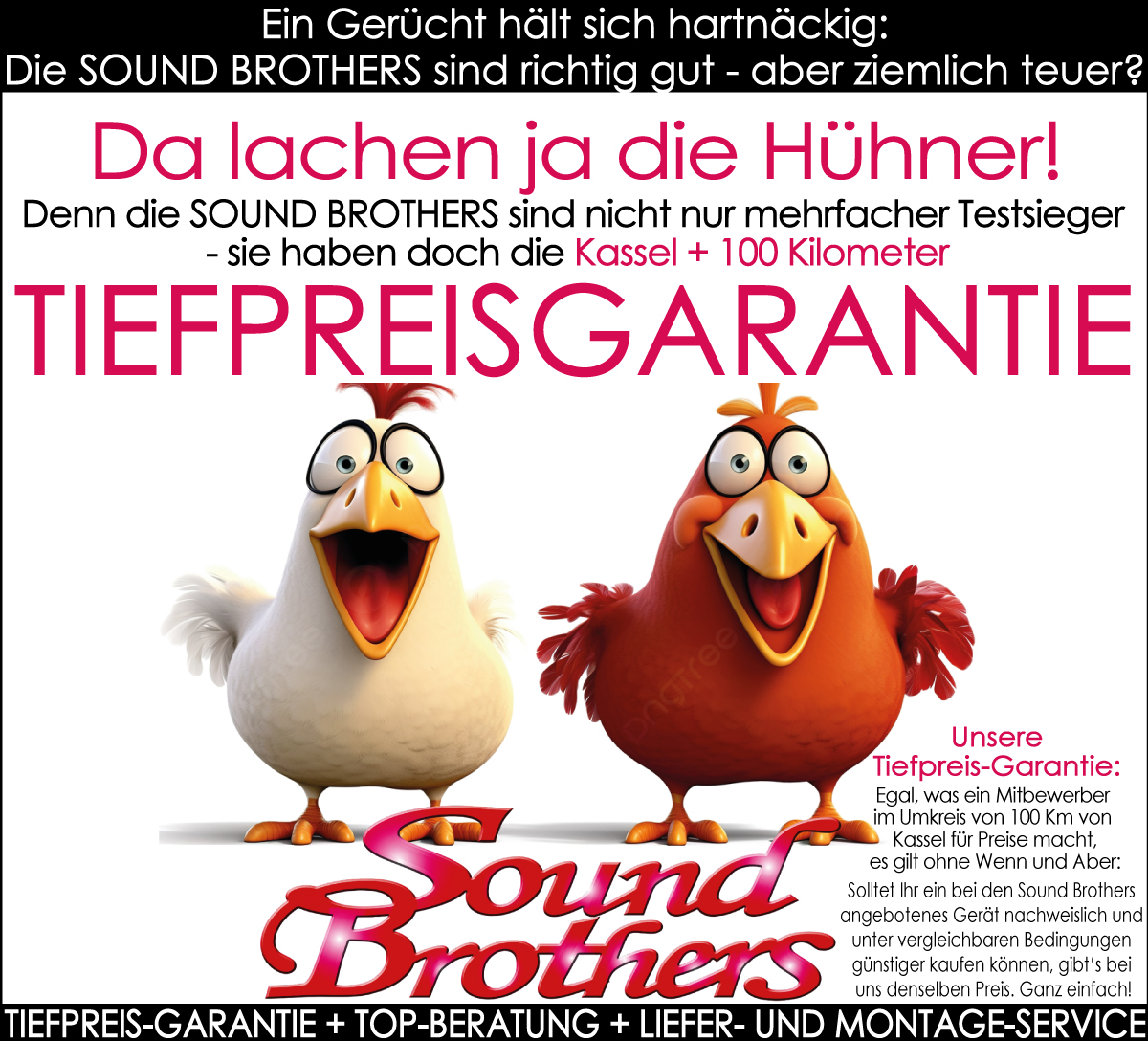 Wir haben verstanden - und das schon vor langer Zeit: Ihr wollt Top-Produkte, Top-Beratung, Top-Auswahl, Top-Service und kein ewiges Warten in der Hotline, wenn's mal ein Problem gibt - sondern echte Ansprechpartner. Aber Ihr wollt auch nicht zu viel bezahlen und erwartet Top-Preise. Das ist einfach Euer gutes Recht. Und egal, was unsere Mitbewerber im Umkreis von 100 km von Kassel anbieten - Sound Brothers Kundinnen und Kunden bleiben da völlig entspannt: durch unsere TIEFPREIS-GARANTIE! Wenn der Fernseher da oder dort statt 999,- nur 699 Euro kostet, dann kostet er bei den Brothers ebenfalls maximal 699 Euro. Und wenn Ihr Preise z.B. auf IDEALO vergleicht (macht fast jeder), werdet Ihr schnell erkennen, dass die Sound Brothers Preise auch im Internet-Vergleich superattraktiv sind - natürlich nur bei Ware mit deutscher Seriennummer und deutscher Garantie, denn Importe machen vor allem bei hochwertigen elektronischen Geräten wenig Sinn. Das Leben kann so einfach sein....UND IHR HABT UNS ALS PARTNER. Seit fast 50 Jahren. UNBEZAHLBAR! Herzlichst. Eure Soundbrothers.